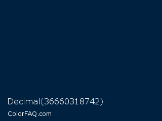 Decimal 36660318742 Color is a very dark blue color and the nearest color is Maastricht Blue #001c3d. Hex code #002240 and RGB value is rgb(0,34,64). In RGB color space, this color is composed of 0% red, 13% green, 25% blue, In CMYK color space, this color is composed of 100% cyan, 47% magenta, 0% yellow , 75% black , In HSL color space, this color has a hue angle of 208° , 100% saturation and 13% lightness.