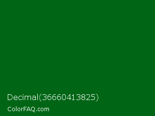 Decimal 36660413825 Color is a very dark green color and the nearest color is Deep Green #056608. Hex code #006615 and RGB value is rgb(0,102,21). In RGB color space, this color is composed of 0% red, 40% green, 8% blue, In CMYK color space, this color is composed of 100% cyan, 0% magenta, 79% yellow , 60% black , In HSL color space, this color has a hue angle of 132° , 100% saturation and 20% lightness.