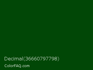 Decimal 36660797798 Color is a very dark green color and the nearest color is Dark Fern #0a480d. Hex code #014706 and RGB value is rgb(1,71,6). In RGB color space, this color is composed of 0% red, 28% green, 2% blue, In CMYK color space, this color is composed of 99% cyan, 0% magenta, 92% yellow , 72% black , In HSL color space, this color has a hue angle of 124° , 97% saturation and 14% lightness.