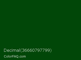 Decimal 36660797799 Color is a very dark green color and the nearest color is Dark Fern #0a480d. Hex code #014707 and RGB value is rgb(1,71,7). In RGB color space, this color is composed of 0% red, 28% green, 3% blue, In CMYK color space, this color is composed of 99% cyan, 0% magenta, 90% yellow , 72% black , In HSL color space, this color has a hue angle of 125° , 97% saturation and 14% lightness.