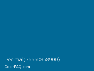 Decimal 36660858900 Color is a dark blue color and the nearest color is Sea Blue #006994. Hex code #016996 and RGB value is rgb(1,105,150). In RGB color space, this color is composed of 0% red, 41% green, 59% blue, In CMYK color space, this color is composed of 99% cyan, 30% magenta, 0% yellow , 41% black , In HSL color space, this color has a hue angle of 198° , 99% saturation and 30% lightness.