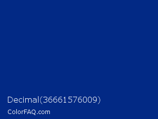 Decimal 36661576009 Color is a dark blue color and the nearest color is Resolution Blue #002387. Hex code #022985 and RGB value is rgb(2,41,133). In RGB color space, this color is composed of 1% red, 16% green, 52% blue, In CMYK color space, this color is composed of 98% cyan, 69% magenta, 0% yellow , 48% black , In HSL color space, this color has a hue angle of 222° , 97% saturation and 26% lightness.