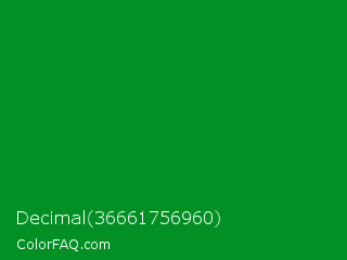 Decimal 36661756960 Color is a dark green color and the nearest color is North Texas Green #059033. Hex code #029024 and RGB value is rgb(2,144,36). In RGB color space, this color is composed of 1% red, 56% green, 14% blue, In CMYK color space, this color is composed of 99% cyan, 0% magenta, 75% yellow , 44% black , In HSL color space, this color has a hue angle of 134° , 97% saturation and 29% lightness.
