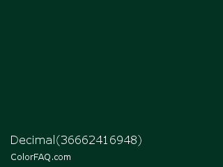 Decimal 36662416948 Color is a very dark green color and the nearest color is Dark Green #013220. Hex code #033122 and RGB value is rgb(3,49,34). In RGB color space, this color is composed of 1% red, 19% green, 13% blue, In CMYK color space, this color is composed of 94% cyan, 0% magenta, 31% yellow , 81% black , In HSL color space, this color has a hue angle of 160° , 88% saturation and 10% lightness.