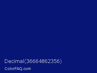 Decimal 36664862356 Color is a dark blue color and the nearest color is Dark Imperial Blue #00147e. Hex code #071576 and RGB value is rgb(7,21,118). In RGB color space, this color is composed of 3% red, 8% green, 46% blue, In CMYK color space, this color is composed of 94% cyan, 82% magenta, 0% yellow , 54% black , In HSL color space, this color has a hue angle of 232° , 89% saturation and 25% lightness.