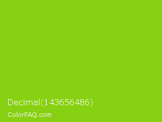 Decimal 143656486 Color is a normal green color and the nearest color is Sheen Green #8fd400. Hex code #87d012 and RGB value is rgb(135,208,18). In RGB color space, this color is composed of 53% red, 82% green, 7% blue, In CMYK color space, this color is composed of 35% cyan, 0% magenta, 91% yellow , 18% black , In HSL color space, this color has a hue angle of 83° , 84% saturation and 44% lightness.