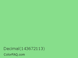 Decimal 143672113 Color is a light green color and the nearest color is Light Green #90ee90. Hex code #87de8b and RGB value is rgb(135,222,139). In RGB color space, this color is composed of 53% red, 87% green, 55% blue, In CMYK color space, this color is composed of 39% cyan, 0% magenta, 37% yellow , 13% black , In HSL color space, this color has a hue angle of 123° , 57% saturation and 70% lightness.