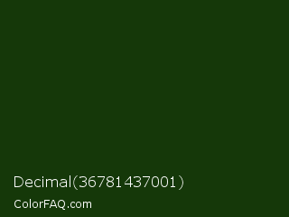 Decimal 36781437001 Color is a very dark green color and the nearest color is Palm Leaf #19330e. Hex code #153809 and RGB value is rgb(21,56,9). In RGB color space, this color is composed of 8% red, 22% green, 4% blue, In CMYK color space, this color is composed of 63% cyan, 0% magenta, 84% yellow , 78% black , In HSL color space, this color has a hue angle of 105° , 72% saturation and 13% lightness.