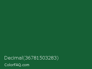 Decimal 36781503283 Color is a dark green color and the nearest color is Green Pea #1d6142. Hex code #156035 and RGB value is rgb(21,96,53). In RGB color space, this color is composed of 8% red, 38% green, 21% blue, In CMYK color space, this color is composed of 78% cyan, 0% magenta, 45% yellow , 62% black , In HSL color space, this color has a hue angle of 146° , 64% saturation and 23% lightness.