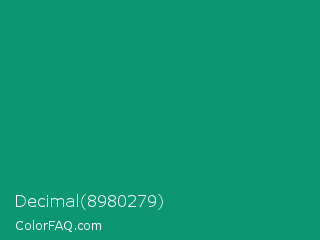 Decimal 8980279 Color is a normal green color and the nearest color is Green NCS #009f6b. Hex code #0d9771 and RGB value is rgb(13,151,113). In RGB color space, this color is composed of 5% red, 59% green, 44% blue, In CMYK color space, this color is composed of 91% cyan, 0% magenta, 25% yellow , 41% black , In HSL color space, this color has a hue angle of 163° , 84% saturation and 32% lightness.
