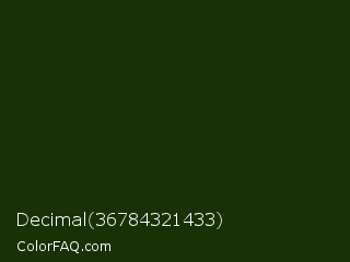 Decimal 36784321433 Color is a very dark green color and the nearest color is Deep Forest Green #182d09. Hex code #193107 and RGB value is rgb(25,49,7). In RGB color space, this color is composed of 10% red, 19% green, 3% blue, In CMYK color space, this color is composed of 49% cyan, 0% magenta, 86% yellow , 81% black , In HSL color space, this color has a hue angle of 94° , 75% saturation and 11% lightness.
