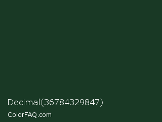 Decimal 36784329847 Color is a very dark green color and the nearest color is Phthalo Green #123524. Hex code #193925 and RGB value is rgb(25,57,37). In RGB color space, this color is composed of 10% red, 22% green, 15% blue, In CMYK color space, this color is composed of 56% cyan, 0% magenta, 35% yellow , 78% black , In HSL color space, this color has a hue angle of 143° , 39% saturation and 16% lightness.