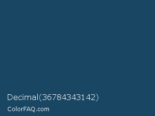 Decimal 36784343142 Color is a dark blue color and the nearest color is Cello #1e385b. Hex code #194662 and RGB value is rgb(25,70,98). In RGB color space, this color is composed of 10% red, 27% green, 38% blue, In CMYK color space, this color is composed of 74% cyan, 29% magenta, 0% yellow , 62% black , In HSL color space, this color has a hue angle of 203° , 59% saturation and 24% lightness.