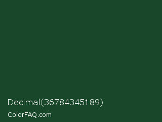 Decimal 36784345189 Color is a very dark green color and the nearest color is Cal Poly Pomona Green #1e4d2b. Hex code #194729 and RGB value is rgb(25,71,41). In RGB color space, this color is composed of 10% red, 28% green, 16% blue, In CMYK color space, this color is composed of 65% cyan, 0% magenta, 42% yellow , 72% black , In HSL color space, this color has a hue angle of 141° , 48% saturation and 19% lightness.