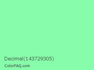 Decimal 143729305 Color is a light green color and the nearest color is Pale Green #98fb98. Hex code #87fdab and RGB value is rgb(135,253,171). In RGB color space, this color is composed of 53% red, 99% green, 67% blue, In CMYK color space, this color is composed of 47% cyan, 0% magenta, 32% yellow , 1% black , In HSL color space, this color has a hue angle of 138° , 97% saturation and 76% lightness.