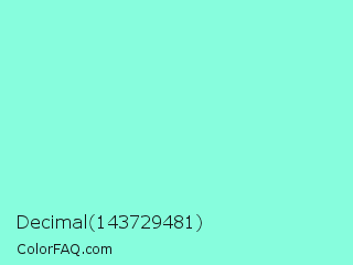 Decimal 143729481 Color is a light cyan color and the nearest color is Aquamarine #7fffd4. Hex code #87fddd and RGB value is rgb(135,253,221). In RGB color space, this color is composed of 53% red, 99% green, 87% blue, In CMYK color space, this color is composed of 47% cyan, 0% magenta, 13% yellow , 1% black , In HSL color space, this color has a hue angle of 164° , 97% saturation and 76% lightness.