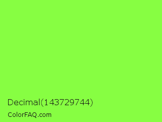 Decimal 143729744 Color is a light green color and the nearest color is Spring Frost #87ff2a. Hex code #87fe42 and RGB value is rgb(135,254,66). In RGB color space, this color is composed of 53% red, 100% green, 26% blue, In CMYK color space, this color is composed of 47% cyan, 0% magenta, 74% yellow , 0% black , In HSL color space, this color has a hue angle of 98° , 99% saturation and 63% lightness.