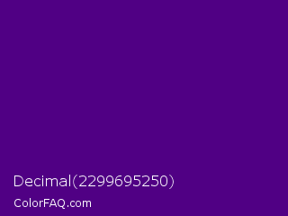 Decimal 2299695250 Color is a dark purple color and the nearest color is Pigment Indigo #4b0082. Hex code #500084 and RGB value is rgb(80,0,132). In RGB color space, this color is composed of 31% red, 0% green, 52% blue, In CMYK color space, this color is composed of 39% cyan, 100% magenta, 0% yellow , 48% black , In HSL color space, this color has a hue angle of 276° , 100% saturation and 26% lightness.