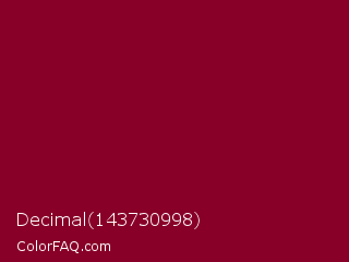 Decimal 143730998 Color is a dark rose color and the nearest color is Paprika #8d0226. Hex code #880028 and RGB value is rgb(136,0,40). In RGB color space, this color is composed of 53% red, 0% green, 16% blue, In CMYK color space, this color is composed of 0% cyan, 100% magenta, 71% yellow , 47% black , In HSL color space, this color has a hue angle of 342° , 100% saturation and 27% lightness.