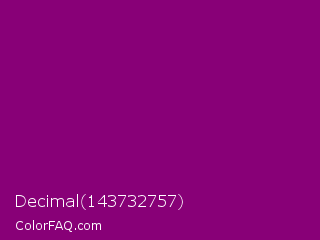Decimal 143732757 Color is a dark magenta color and the nearest color is Patriarch #800080. Hex code #880077 and RGB value is rgb(136,0,119). In RGB color space, this color is composed of 53% red, 0% green, 47% blue, In CMYK color space, this color is composed of 0% cyan, 100% magenta, 13% yellow , 47% black , In HSL color space, this color has a hue angle of 308° , 100% saturation and 27% lightness.