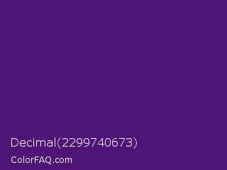 Decimal 2299740673 Color is a dark purple color and the nearest color is Honey Flower #4f1c70. Hex code #501479 and RGB value is rgb(80,20,121). In RGB color space, this color is composed of 31% red, 8% green, 47% blue, In CMYK color space, this color is composed of 34% cyan, 83% magenta, 0% yellow , 53% black , In HSL color space, this color has a hue angle of 276° , 72% saturation and 28% lightness.