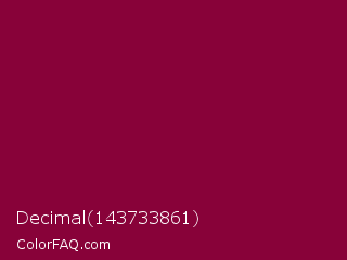 Decimal 143733861 Color is a dark rose color and the nearest color is Siren #7a013a. Hex code #880239 and RGB value is rgb(136,2,57). In RGB color space, this color is composed of 53% red, 1% green, 22% blue, In CMYK color space, this color is composed of 0% cyan, 99% magenta, 58% yellow , 47% black , In HSL color space, this color has a hue angle of 335° , 97% saturation and 27% lightness.