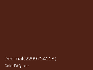 Decimal 2299754118 Color is a very dark red color and the nearest color is Brown Derby #492615. Hex code #502216 and RGB value is rgb(80,34,22). In RGB color space, this color is composed of 31% red, 13% green, 9% blue, In CMYK color space, this color is composed of 0% cyan, 58% magenta, 73% yellow , 69% black , In HSL color space, this color has a hue angle of 12° , 57% saturation and 20% lightness.