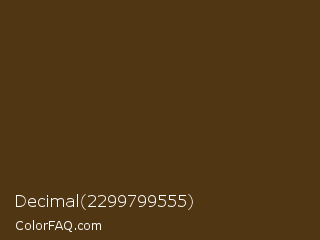 Decimal 2299799555 Color is a very dark orange color and the nearest color is Punga #4d3d14. Hex code #503613 and RGB value is rgb(80,54,19). In RGB color space, this color is composed of 31% red, 21% green, 7% blue, In CMYK color space, this color is composed of 0% cyan, 33% magenta, 76% yellow , 69% black , In HSL color space, this color has a hue angle of 34° , 62% saturation and 19% lightness.