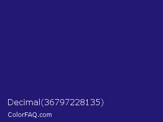 Decimal 36797228135 Color is a dark indigo color and the nearest color is Midnight Blue #191970. Hex code #231873 and RGB value is rgb(35,24,115). In RGB color space, this color is composed of 14% red, 9% green, 45% blue, In CMYK color space, this color is composed of 70% cyan, 79% magenta, 0% yellow , 55% black , In HSL color space, this color has a hue angle of 247° , 65% saturation and 27% lightness.