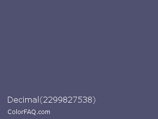 Decimal 2299827538 Color is a normal blue color and the nearest color is Independence #4c516d. Hex code #505070 and RGB value is rgb(80,80,112). In RGB color space, this color is composed of 31% red, 31% green, 44% blue, In CMYK color space, this color is composed of 29% cyan, 29% magenta, 0% yellow , 56% black , In HSL color space, this color has a hue angle of 240° , 17% saturation and 38% lightness.