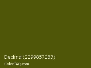 Decimal 2299857283 Color is a very dark yellow color and the nearest color is Verdun Green #495400. Hex code #505607 and RGB value is rgb(80,86,7). In RGB color space, this color is composed of 31% red, 34% green, 3% blue, In CMYK color space, this color is composed of 7% cyan, 0% magenta, 92% yellow , 66% black , In HSL color space, this color has a hue angle of 65° , 85% saturation and 18% lightness.