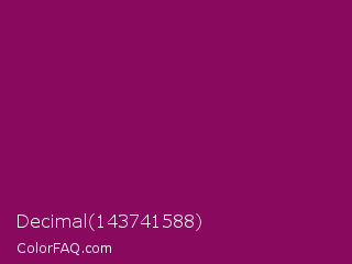Decimal 143741588 Color is a dark magenta color and the nearest color is Cardinal Pink #8c055e. Hex code #88095e and RGB value is rgb(136,9,94). In RGB color space, this color is composed of 53% red, 4% green, 37% blue, In CMYK color space, this color is composed of 0% cyan, 93% magenta, 31% yellow , 47% black , In HSL color space, this color has a hue angle of 320° , 88% saturation and 28% lightness.