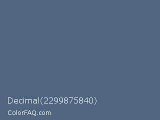 Decimal 2299875840 Color is a normal blue color and the nearest color is Paynes Grey #536878. Hex code #506680 and RGB value is rgb(80,102,128). In RGB color space, this color is composed of 31% red, 40% green, 50% blue, In CMYK color space, this color is composed of 38% cyan, 20% magenta, 0% yellow , 50% black , In HSL color space, this color has a hue angle of 213° , 23% saturation and 41% lightness.