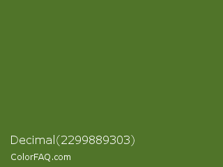 Decimal 2299889303 Color is a normal green color and the nearest color is Sap Green #507d2a. Hex code #507429 and RGB value is rgb(80,116,41). In RGB color space, this color is composed of 31% red, 45% green, 16% blue, In CMYK color space, this color is composed of 31% cyan, 0% magenta, 65% yellow , 55% black , In HSL color space, this color has a hue angle of 89° , 48% saturation and 31% lightness.