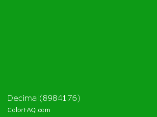 Decimal 8984176 Color is a normal green color and the nearest color is India Green #138808. Hex code #0d9b16 and RGB value is rgb(13,155,22). In RGB color space, this color is composed of 5% red, 61% green, 9% blue, In CMYK color space, this color is composed of 92% cyan, 0% magenta, 86% yellow , 39% black , In HSL color space, this color has a hue angle of 124° , 85% saturation and 33% lightness.