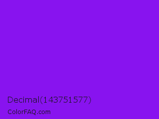 Decimal 143751577 Color is a normal purple color and the nearest color is Electric Violet #8b00ff. Hex code #8813ef and RGB value is rgb(136,19,239). In RGB color space, this color is composed of 53% red, 7% green, 94% blue, In CMYK color space, this color is composed of 43% cyan, 92% magenta, 0% yellow , 6% black , In HSL color space, this color has a hue angle of 272° , 87% saturation and 51% lightness.