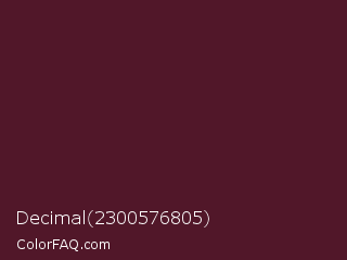 Decimal 2300576805 Color is a very dark rose color and the nearest color is Wine Berry #591d35. Hex code #511729 and RGB value is rgb(81,23,41). In RGB color space, this color is composed of 32% red, 9% green, 16% blue, In CMYK color space, this color is composed of 0% cyan, 72% magenta, 49% yellow , 68% black , In HSL color space, this color has a hue angle of 341° , 56% saturation and 20% lightness.