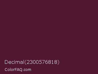 Decimal 2300576818 Color is a very dark rose color and the nearest color is Wine Berry #591d35. Hex code #511730 and RGB value is rgb(81,23,48). In RGB color space, this color is composed of 32% red, 9% green, 19% blue, In CMYK color space, this color is composed of 0% cyan, 72% magenta, 41% yellow , 68% black , In HSL color space, this color has a hue angle of 334° , 56% saturation and 20% lightness.