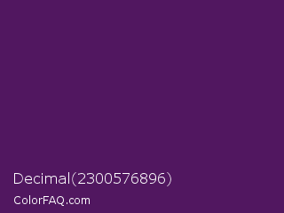 Decimal 2300576896 Color is a dark purple color and the nearest color is Scarlet Gum #431560. Hex code #511760 and RGB value is rgb(81,23,96). In RGB color space, this color is composed of 32% red, 9% green, 38% blue, In CMYK color space, this color is composed of 16% cyan, 76% magenta, 0% yellow , 62% black , In HSL color space, this color has a hue angle of 288° , 61% saturation and 23% lightness.