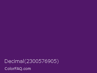 Decimal 2300576905 Color is a dark purple color and the nearest color is Honey Flower #4f1c70. Hex code #511769 and RGB value is rgb(81,23,105). In RGB color space, this color is composed of 32% red, 9% green, 41% blue, In CMYK color space, this color is composed of 23% cyan, 78% magenta, 0% yellow , 59% black , In HSL color space, this color has a hue angle of 282° , 64% saturation and 25% lightness.