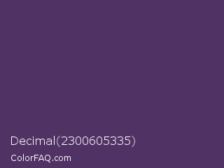 Decimal 2300605335 Color is a dark purple color and the nearest color is Bossanova #4e2a5a. Hex code #513265 and RGB value is rgb(81,50,101). In RGB color space, this color is composed of 32% red, 20% green, 40% blue, In CMYK color space, this color is composed of 20% cyan, 50% magenta, 0% yellow , 60% black , In HSL color space, this color has a hue angle of 276° , 34% saturation and 30% lightness.
