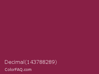 Decimal 143788289 Color is a normal rose color and the nearest color is Disco #871550. Hex code #881f45 and RGB value is rgb(136,31,69). In RGB color space, this color is composed of 53% red, 12% green, 27% blue, In CMYK color space, this color is composed of 0% cyan, 77% magenta, 49% yellow , 47% black , In HSL color space, this color has a hue angle of 338° , 63% saturation and 33% lightness.