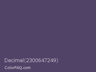 Decimal 2300647249 Color is a normal violet color and the nearest color is Mulled Wine #4e4562. Hex code #514367 and RGB value is rgb(81,67,103). In RGB color space, this color is composed of 32% red, 26% green, 40% blue, In CMYK color space, this color is composed of 21% cyan, 35% magenta, 0% yellow , 60% black , In HSL color space, this color has a hue angle of 263° , 21% saturation and 33% lightness.