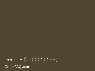 Decimal 2300650598 Color is a dark orange color and the nearest color is Judge Gray #544333. Hex code #514632 and RGB value is rgb(81,70,50). In RGB color space, this color is composed of 32% red, 27% green, 20% blue, In CMYK color space, this color is composed of 0% cyan, 14% magenta, 38% yellow , 68% black , In HSL color space, this color has a hue angle of 39° , 24% saturation and 26% lightness.