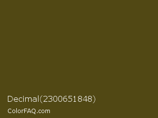 Decimal 2300651848 Color is a very dark yellow color and the nearest color is Bronzetone #4d400f. Hex code #514814 and RGB value is rgb(81,72,20). In RGB color space, this color is composed of 32% red, 28% green, 8% blue, In CMYK color space, this color is composed of 0% cyan, 11% magenta, 75% yellow , 68% black , In HSL color space, this color has a hue angle of 51° , 60% saturation and 20% lightness.