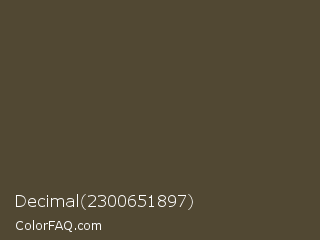 Decimal 2300651897 Color is a dark orange color and the nearest color is Judge Gray #544333. Hex code #514833 and RGB value is rgb(81,72,51). In RGB color space, this color is composed of 32% red, 28% green, 20% blue, In CMYK color space, this color is composed of 0% cyan, 11% magenta, 37% yellow , 68% black , In HSL color space, this color has a hue angle of 42° , 23% saturation and 26% lightness.