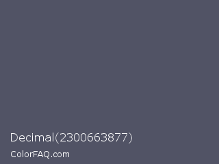 Decimal 2300663877 Color is a normal blue color and the nearest color is Scarpa Flow #585562. Hex code #515365 and RGB value is rgb(81,83,101). In RGB color space, this color is composed of 32% red, 33% green, 40% blue, In CMYK color space, this color is composed of 20% cyan, 18% magenta, 0% yellow , 60% black , In HSL color space, this color has a hue angle of 234° , 11% saturation and 36% lightness.
