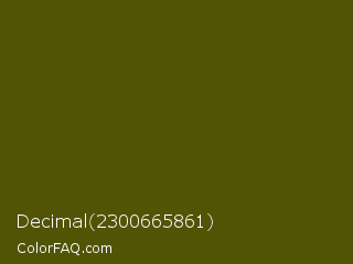 Decimal 2300665861 Color is a very dark yellow color and the nearest color is Verdun Green #495400. Hex code #515405 and RGB value is rgb(81,84,5). In RGB color space, this color is composed of 32% red, 33% green, 2% blue, In CMYK color space, this color is composed of 4% cyan, 0% magenta, 94% yellow , 67% black , In HSL color space, this color has a hue angle of 62° , 89% saturation and 17% lightness.
