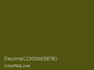 Decimal 2300665878 Color is a very dark yellow color and the nearest color is Saratoga #555b10. Hex code #515410 and RGB value is rgb(81,84,16). In RGB color space, this color is composed of 32% red, 33% green, 6% blue, In CMYK color space, this color is composed of 4% cyan, 0% magenta, 81% yellow , 67% black , In HSL color space, this color has a hue angle of 63° , 68% saturation and 20% lightness.