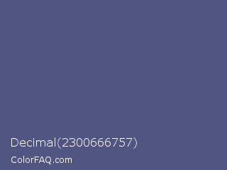 Decimal 2300666757 Color is a normal blue color and the nearest color is Purple Navy #4e5180. Hex code #515581 and RGB value is rgb(81,85,129). In RGB color space, this color is composed of 32% red, 33% green, 51% blue, In CMYK color space, this color is composed of 37% cyan, 34% magenta, 0% yellow , 49% black , In HSL color space, this color has a hue angle of 235° , 23% saturation and 41% lightness.